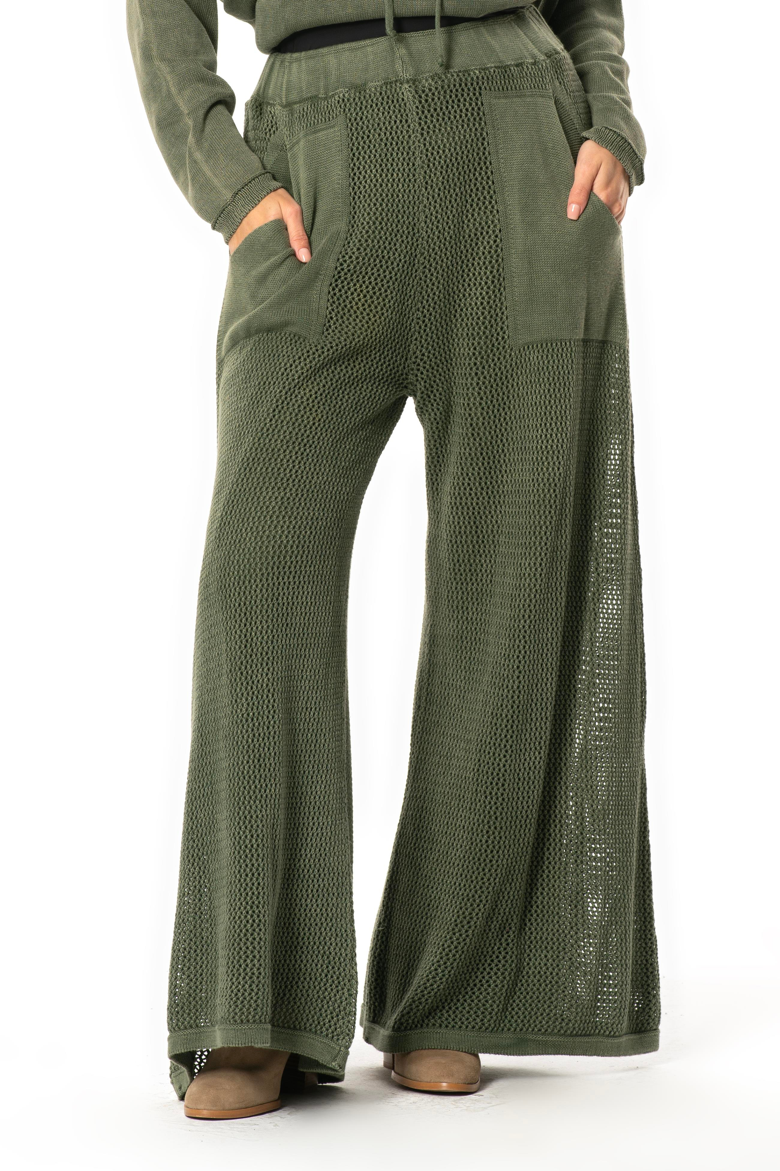File Detaylı Bol Paça Beli Lastikli Uzun Sonbahar ve Kışlık Cepli Triko Pantolon Haki Hk