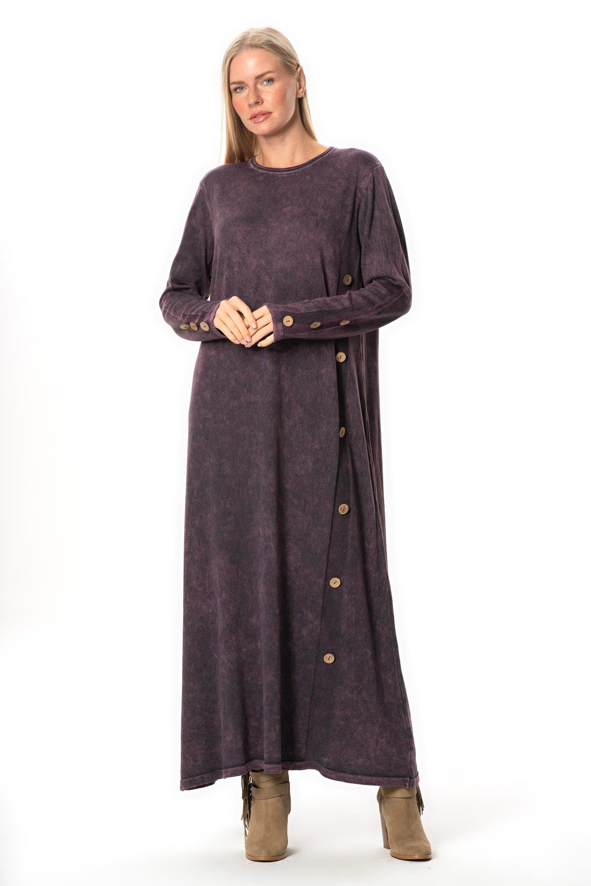 Uzun Kol Gözde Bisiklet Yaka Düğme Detaylı Sonbahar ve Kışlık Uzun Triko Elbise Mürdüm Mrd (T36552)
