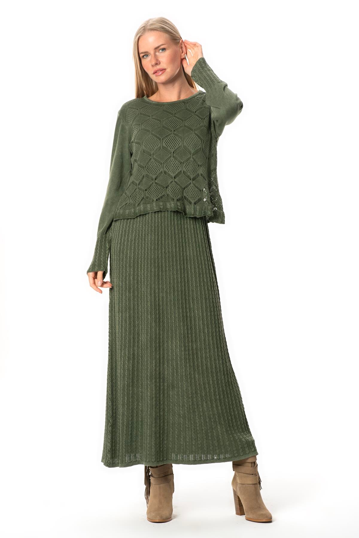 Uzun Kol Ahu Otantik Örgü Desenli Kışlık Uzun Triko Elbise Haki Hk (T30650)