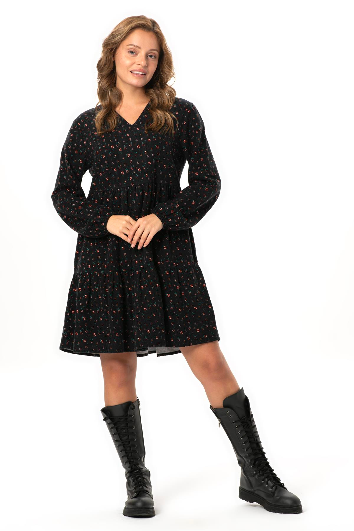 Uzun Kol Alara Çiçek Desenli V Yaka Pazen Kısa Kışlık Elbise Siyah Syh (822.87)