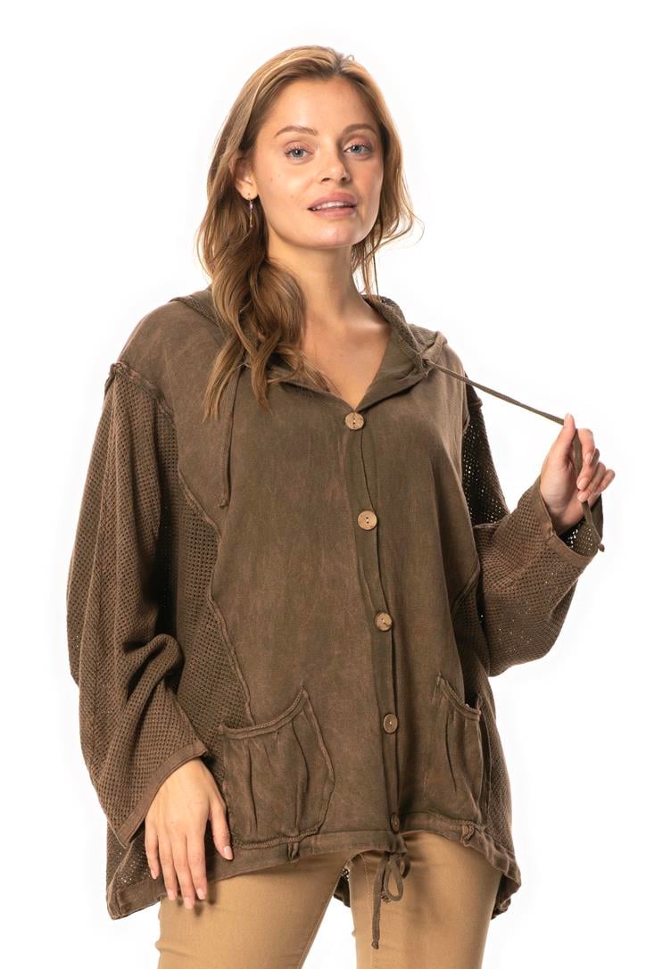 Uzun Kol Ceren Fileli Düğme Detaylı Çift Cepli Kışlık Kapüşonlu Triko Bluz Kahve Khv (T33942)