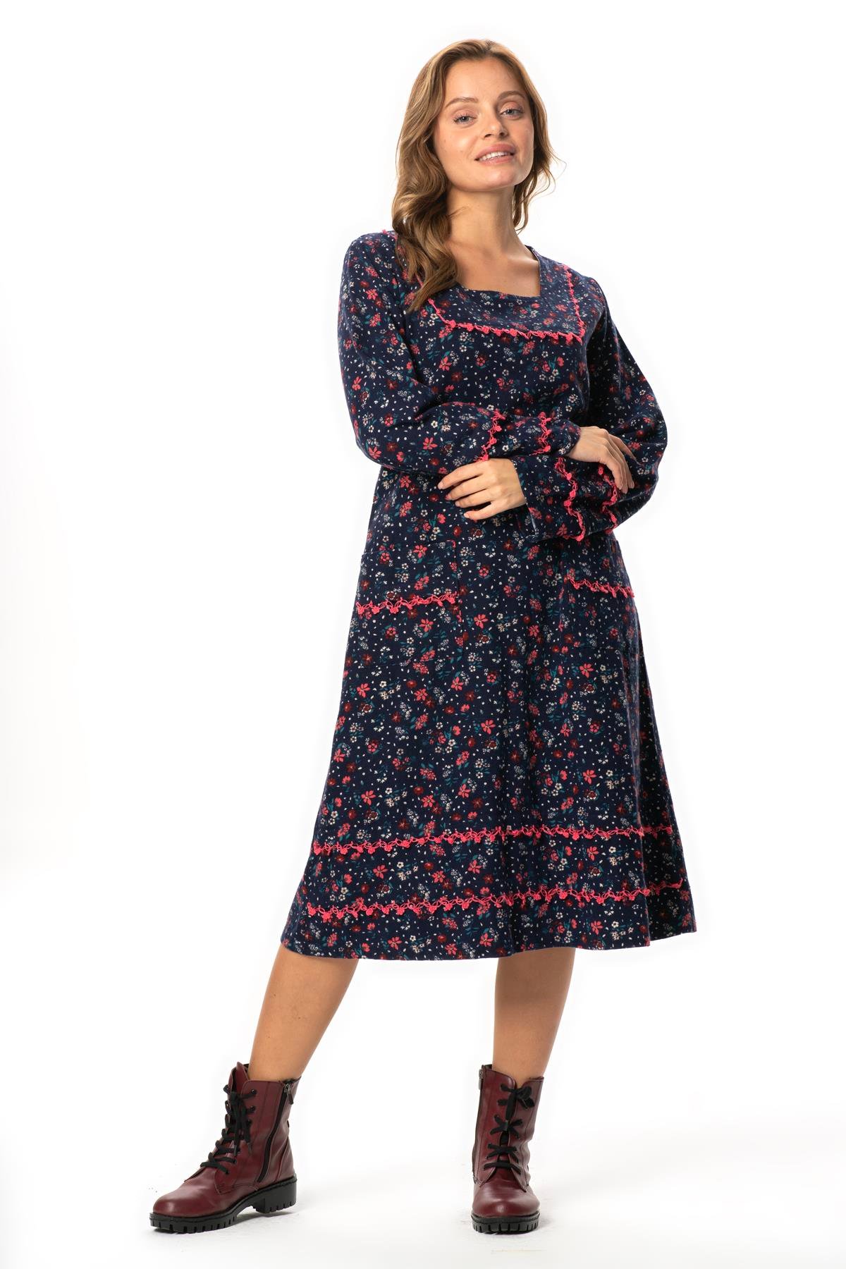 Uzun Kol Firdevs Yuvarlak Yaka Cep Detaylı Kısa Kışlık Pazen Elbise Çiçek Desen Lacivert Lcvt (822.81)