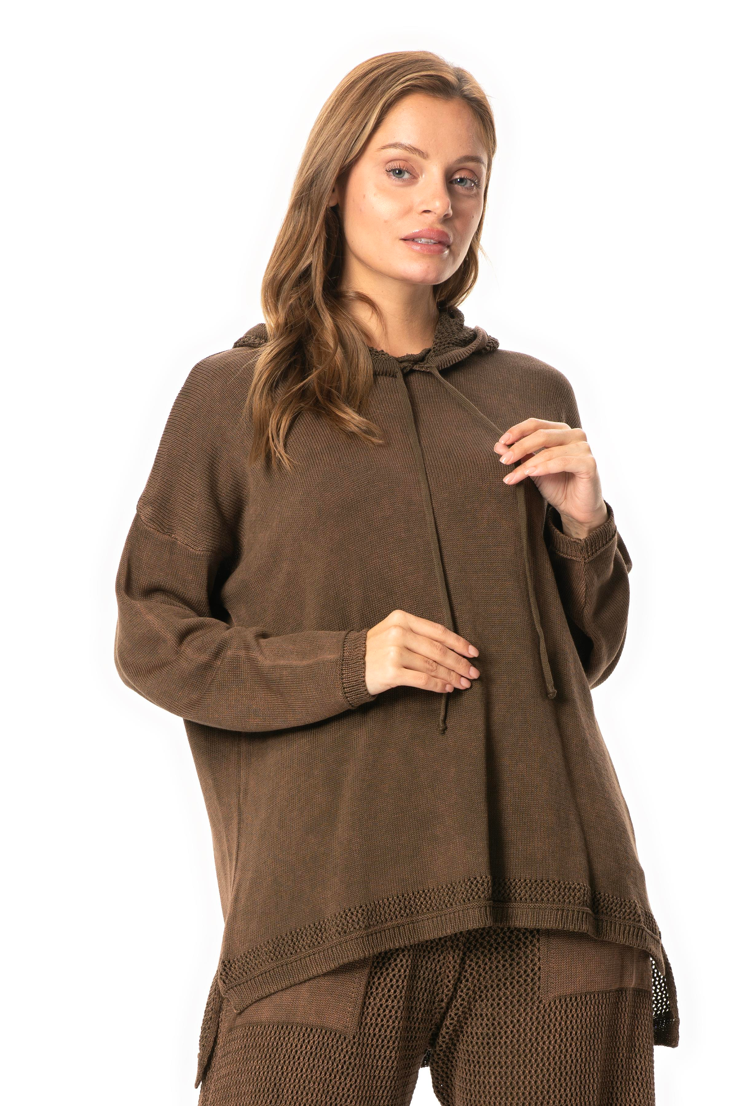 Uzun Kol Kapüşonlu Fileli Sonbahar ve Kışlık Triko Bluz Kahve Khv (T34752-1)
